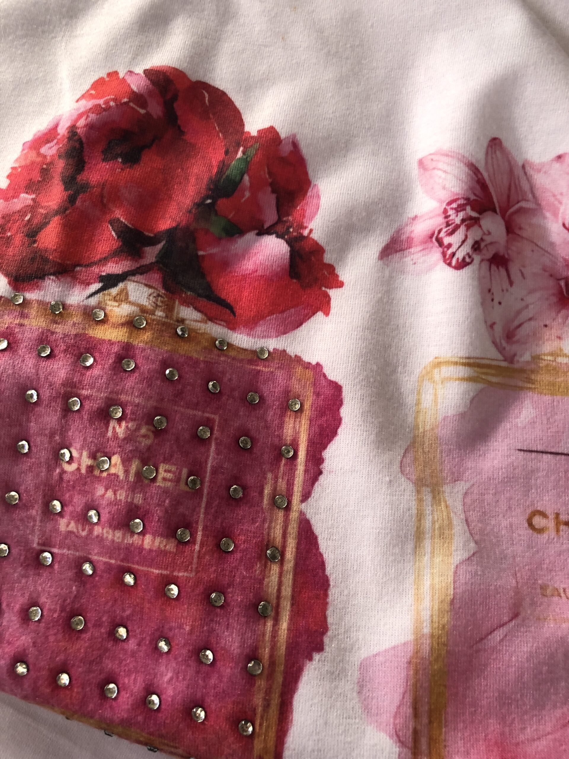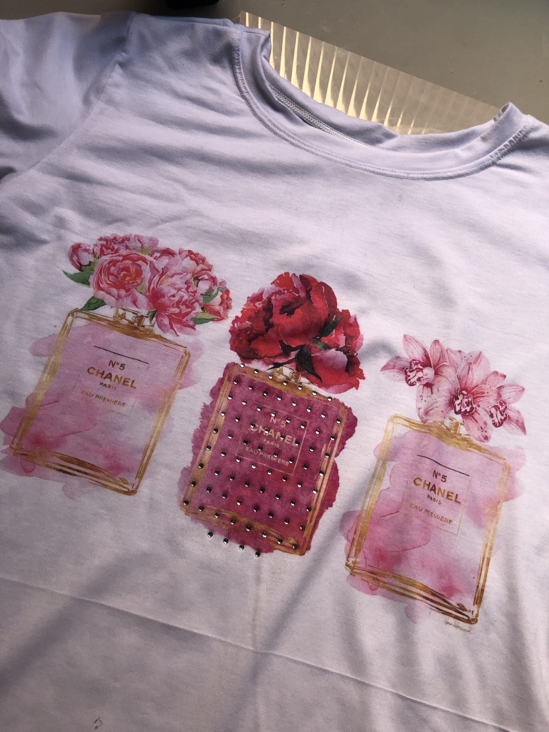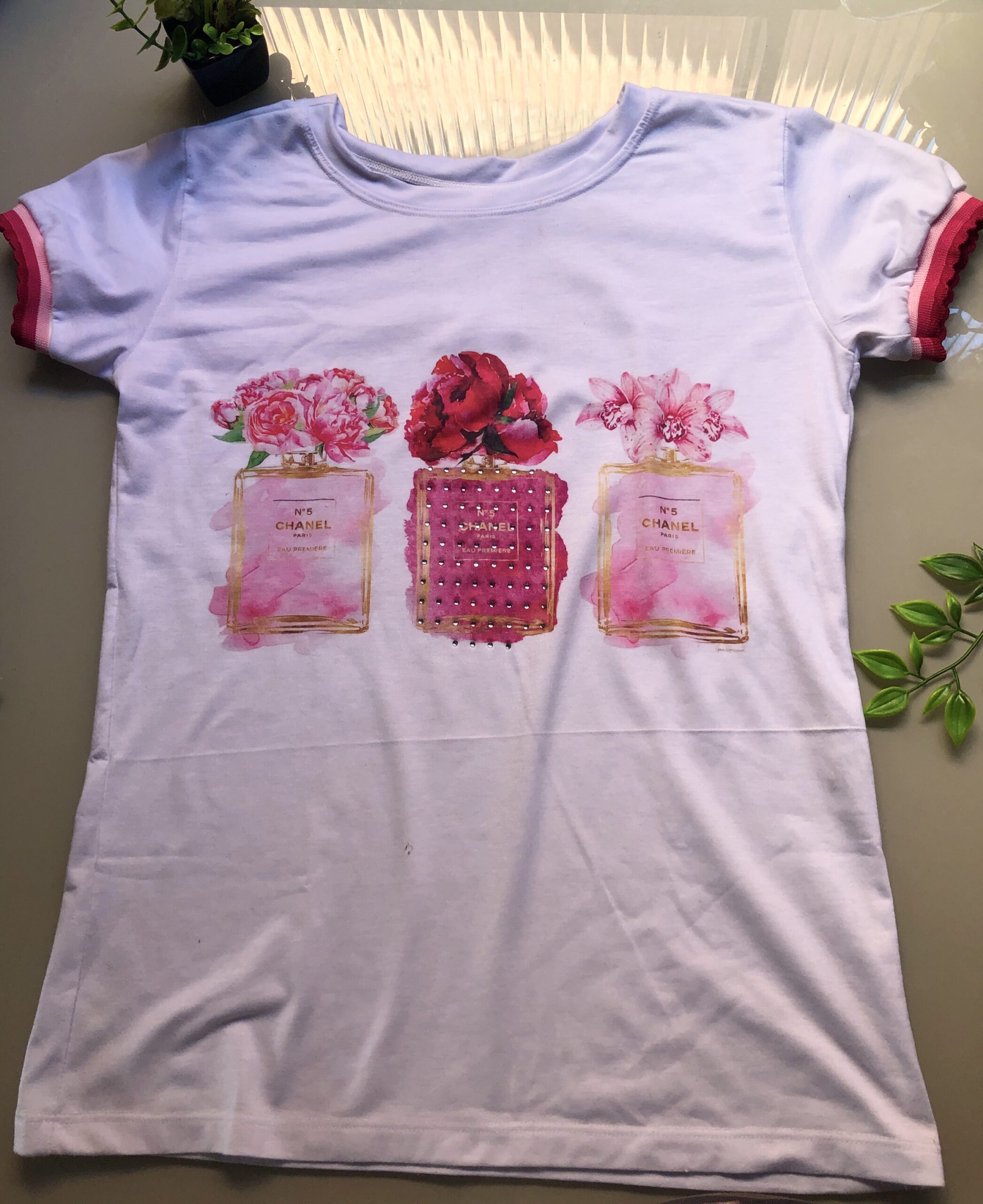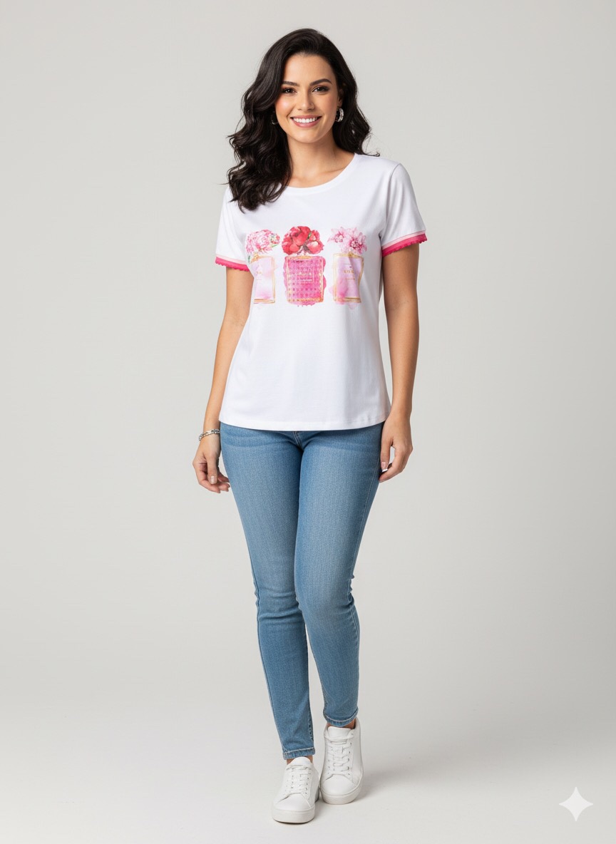 Apresentamos nossa camiseta branca com uma estampa super charmosa de frascos de perfume e flores em tons de rosa. Perfeita para um look descontraído e cheio de personalidade, ela é feita de tecido macio e confortável. Combine com jeans ou shorts para um visual leve e moderno.