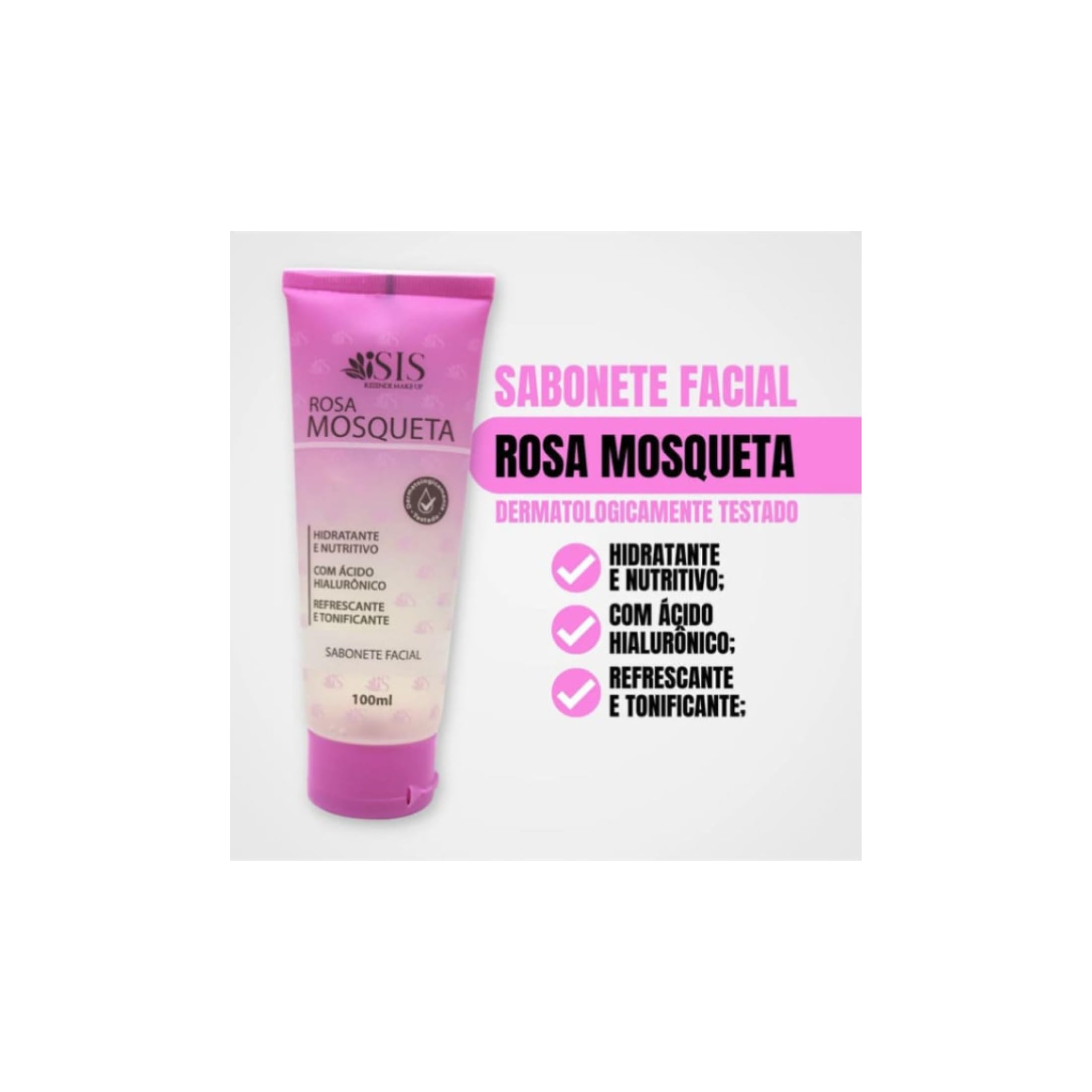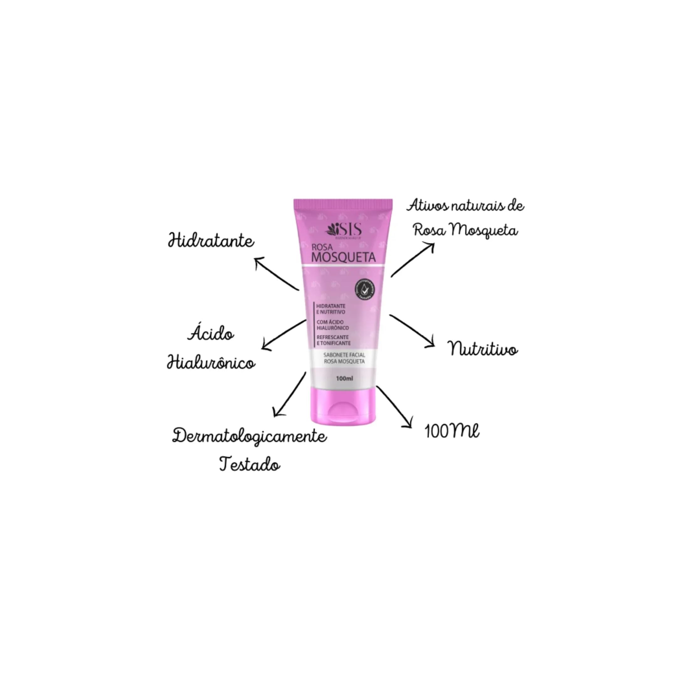 - O Sabonete Facial Rosa Mosqueta da Isis Rezende foi desenvolvido para limpar peles secas e extra secas. Contém princípios ativos de Rosa Mosqueta e Ácido Hialurônico que hidratam, nutrem, refrescam e tonificam a pele